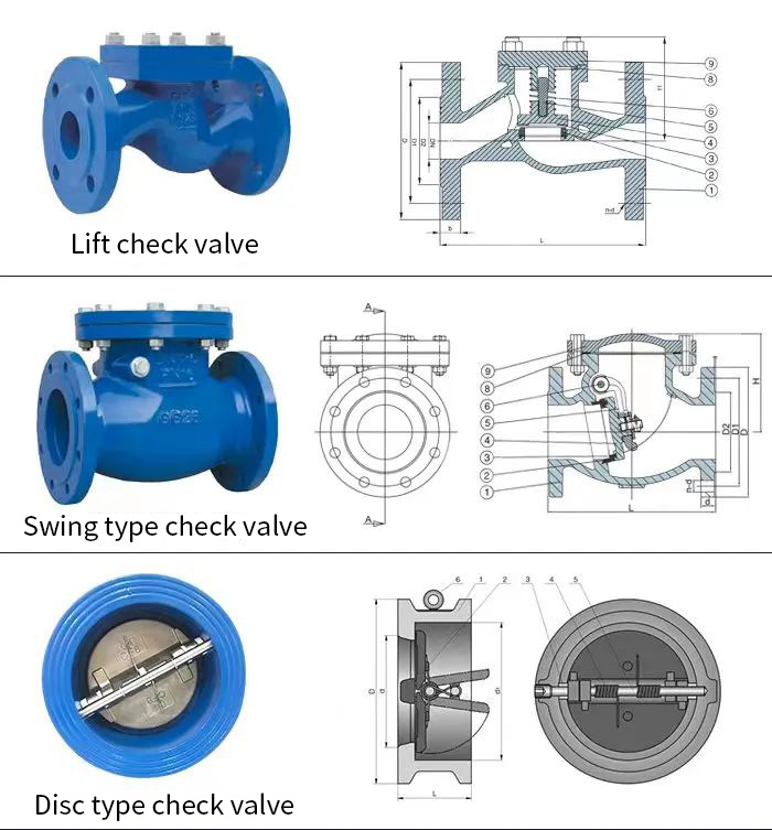 Theo cấu trúc, nó có thể được chia thành ba loại: van nâng, van loại xoay và van chặn kiểu bướm: 1. Van nâng loại nâng hạ được chia thành hai loại: loại thẳng đứng và loại nằm ngang. 2. Van kiểu xoay được chia thành ba loại: đĩa đơn, đĩa kép và đa đĩa. 3. Van chặn bướm một chiều trực tiếp. Van chặn được đề cập ở trên có thể được chia thành bốn loại: kết nối ren, kết nối mặt bích, kết nối hàn và dạng kết nối wafer.