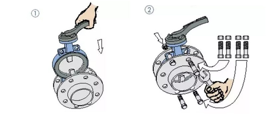 1. Như hình minh họa, đặt van vào giữa hai mặt bích đã lắp sẵn và lưu ý các lỗ bu-lông thẳng hàng.